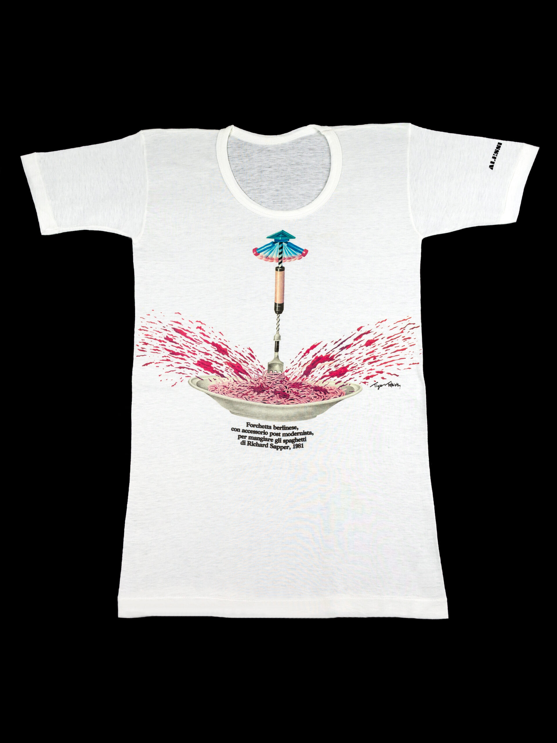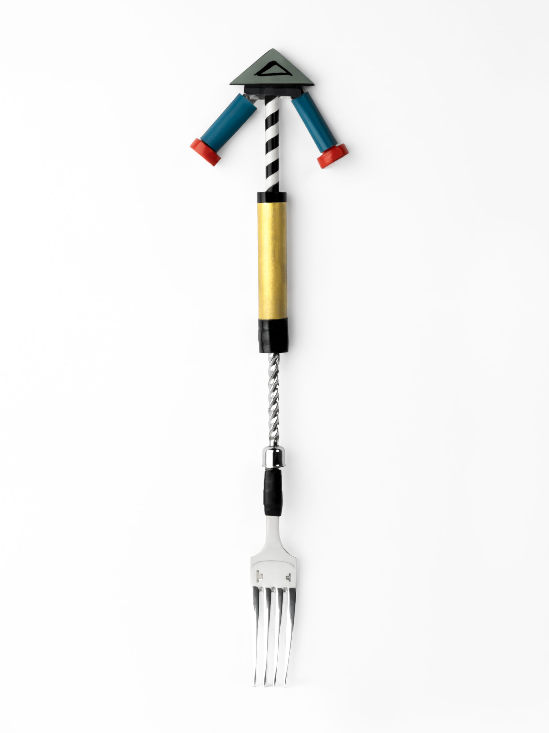 1981.1This self-winding fork was designed for the design conference “Eating and Ritual” organized by Alessi and the International Design Centre of Berlin in 1981. The design was meant as a cheeky joke on people who have difficulty eating spaghetti and on the post-modernist movement of the time.